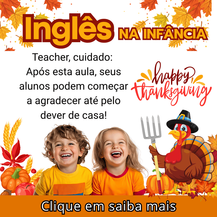 Com os E-books Inglês na Infância você não precisa se preocupar. Ensine o inglês de forma leve, divertida e pedagógica com o e-book Happy Thanksgiving. Com este e-book exclusivo você vai ensinar de forma lúdica e significativa. Ensinar o inglês de forma divertida, faz toda a diferença e isso fará com que as crianças, de 7 a 12 anos pratiquem suas habilidades linguísticas aumentando o seu vocabulário.